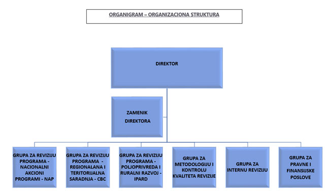 U skladu sa Pravilnikom o unutrašnjem uređenju i sistematizaciji radnih mesta, koji je stupio na snagu 3. februara 2024. godine, u Kancelariji za reviziju sistema upravljanja sredstvima Evropske unije obrazovane su sledeće unutrašnje jedinice: