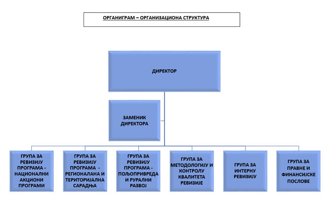У складу са Правилником о унутрашњем уређењу и систематизацији радних места, који је ступио на снагу 3. фебруара 2024. године, у Канцеларији за ревизију система управљања средствима Европске уније образоване су следеће унутрашње јединице: